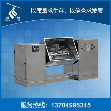 槽型混合機是通過電機減速機機組帶動穿過料斗的主軸使S型的攪拌槳旋轉(zhuǎn),帶動物料徑向軸向翻動往復(fù)摻混,達到物料的均勻混合。