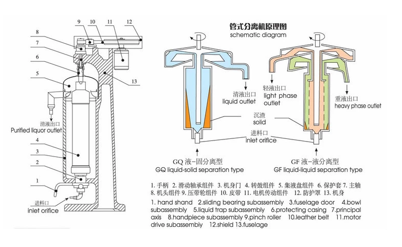 When the equipment works, the rotating drum rotates at high speed around its own axis, forming a strong centrifugal force field.  The material is injected from the liquid inlet nozzle of the bottom liquid inlet system, and the centrifugal force in the rotating drum forces the material liquid to flow upward along the inner wall of the rotating drum and delaminate due to the density difference of different composition of the material liquid.
